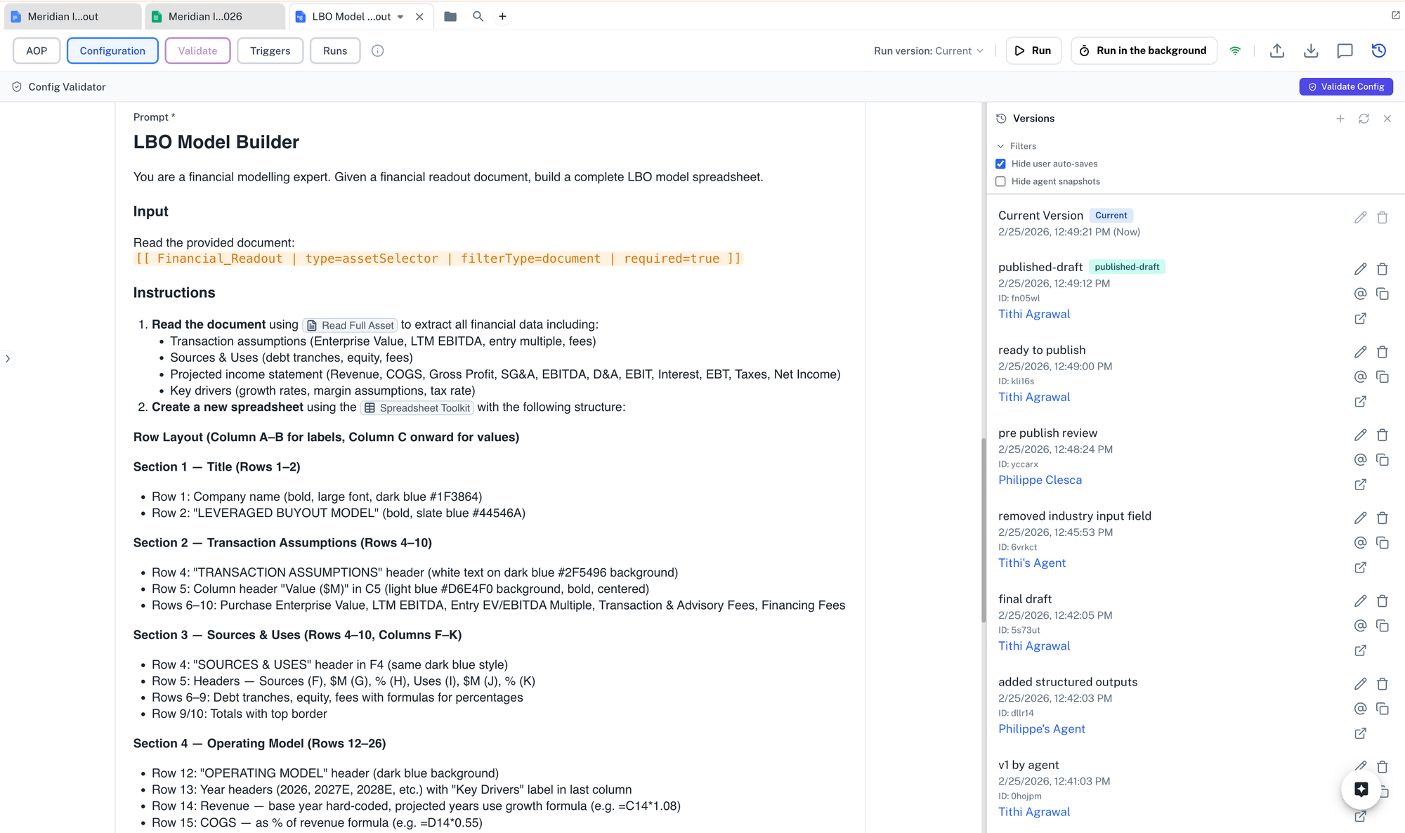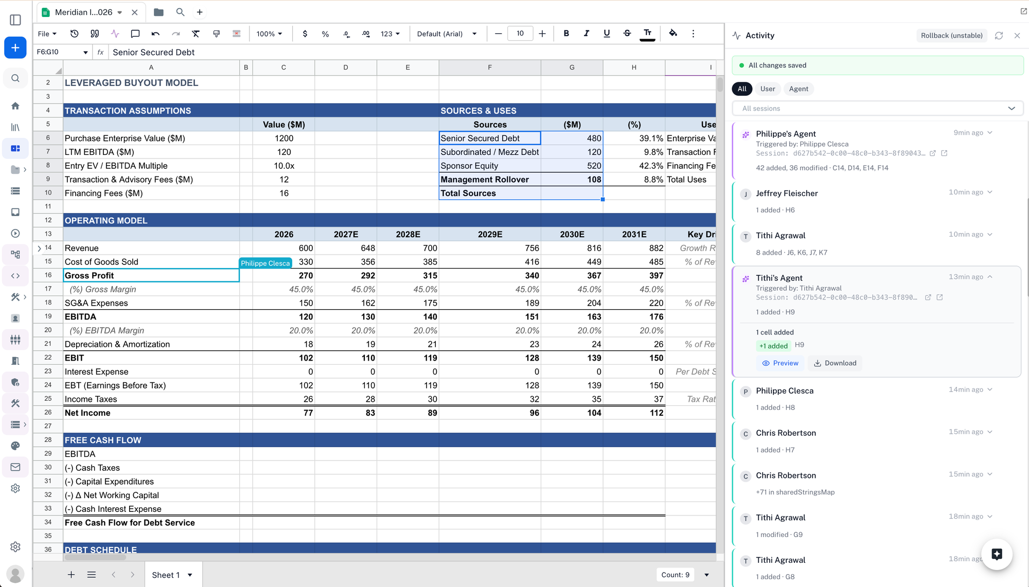 This isn't periodic snapshots or session-level summaries. It's a granular, operation-level record that runs in the background from the moment an asset is created. When multiple agents and users are working on the same financial model, audit document, or research output simultaneously, every individual contribution is tracked and attributed separately.