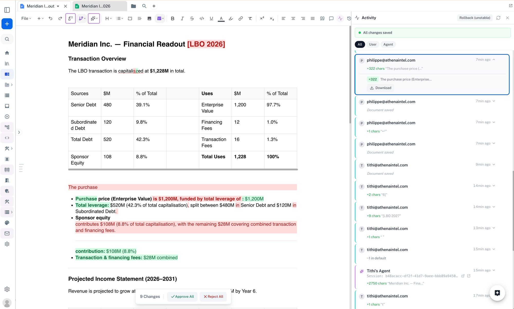 When enabled, track changes highlights every edit in real time — additions in green, deletions in red — with the ability to accept or reject each change individually. This applies equally to human edits and agent edits. A reviewer can scan through an agent's overnight work on a compliance report or financial analysis, approve the substantive changes, and reject the ones that don't meet standards — all without leaving the asset.