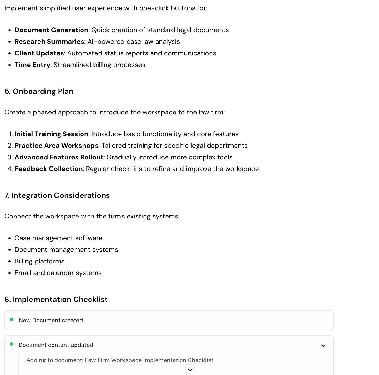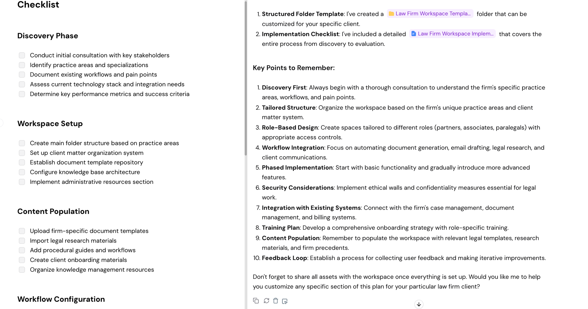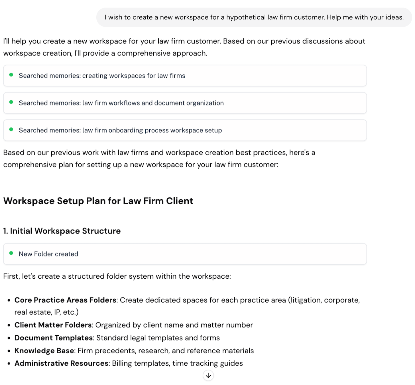 After Tia's training, her knowledge was tested to assess how effectively she could assist with work at Athena Intelligence. The testing began with a request for Tia to assist in creating a new workspace. Tia utilized her memories from past conversations to provide responses to queries.