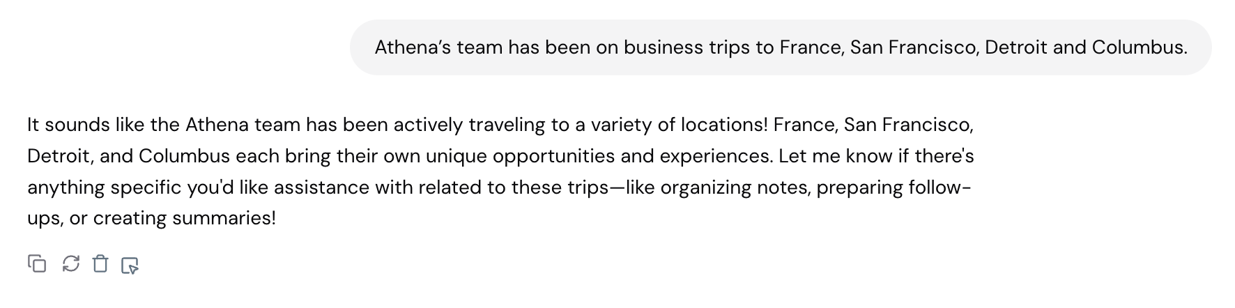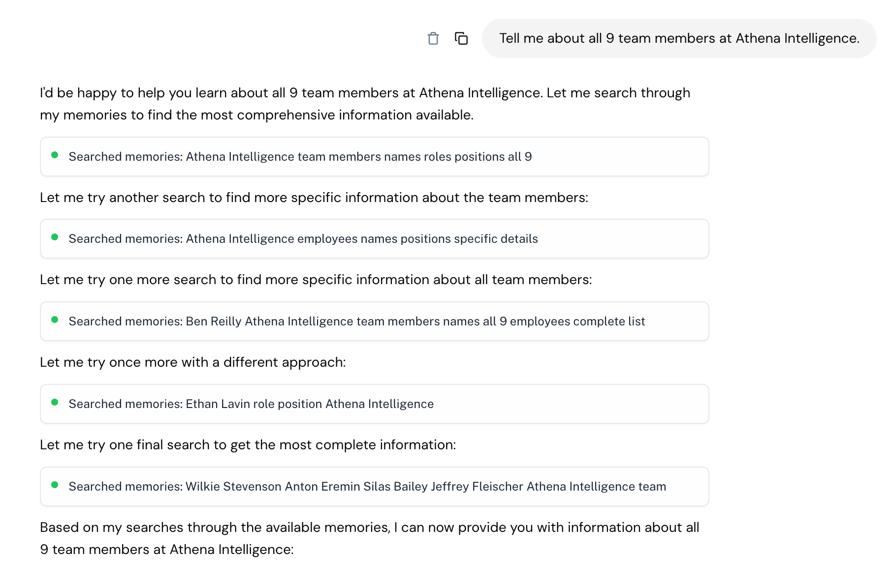 This conversational amnesia created significant friction in user interactions. Without persistent memory, Athena couldn't build meaningful relationships with users over time, as she lacked awareness of user preferences, past conversations, or personal details that had been previously shared. Each interaction existed in isolation, preventing the natural flow and evolution of conversations that humans expect.
