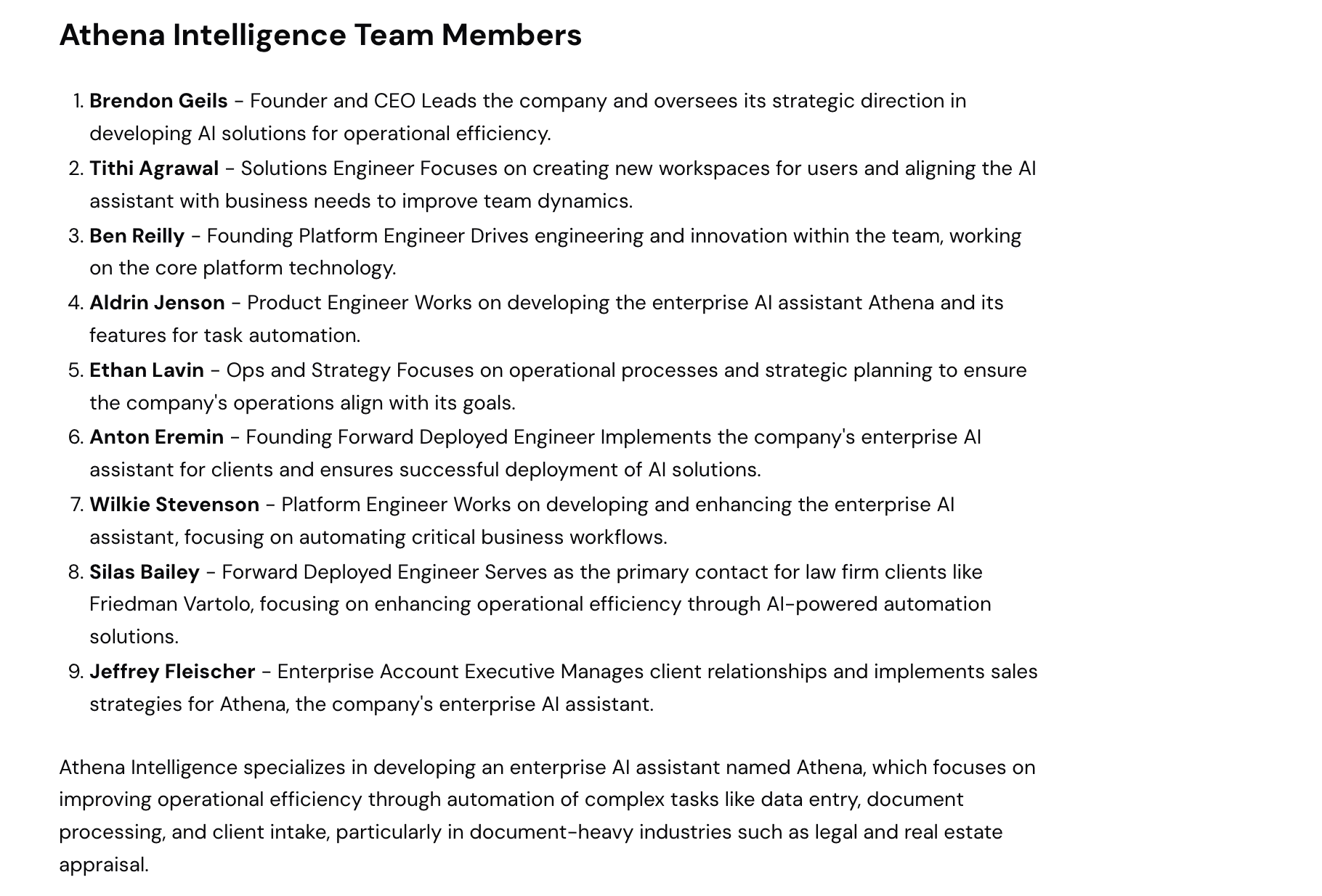 The focus shifted to specific details about Athena’s team members. This included information about their roles and responsibilities, ensuring Tia had a comprehensive understanding of the team dynamics.