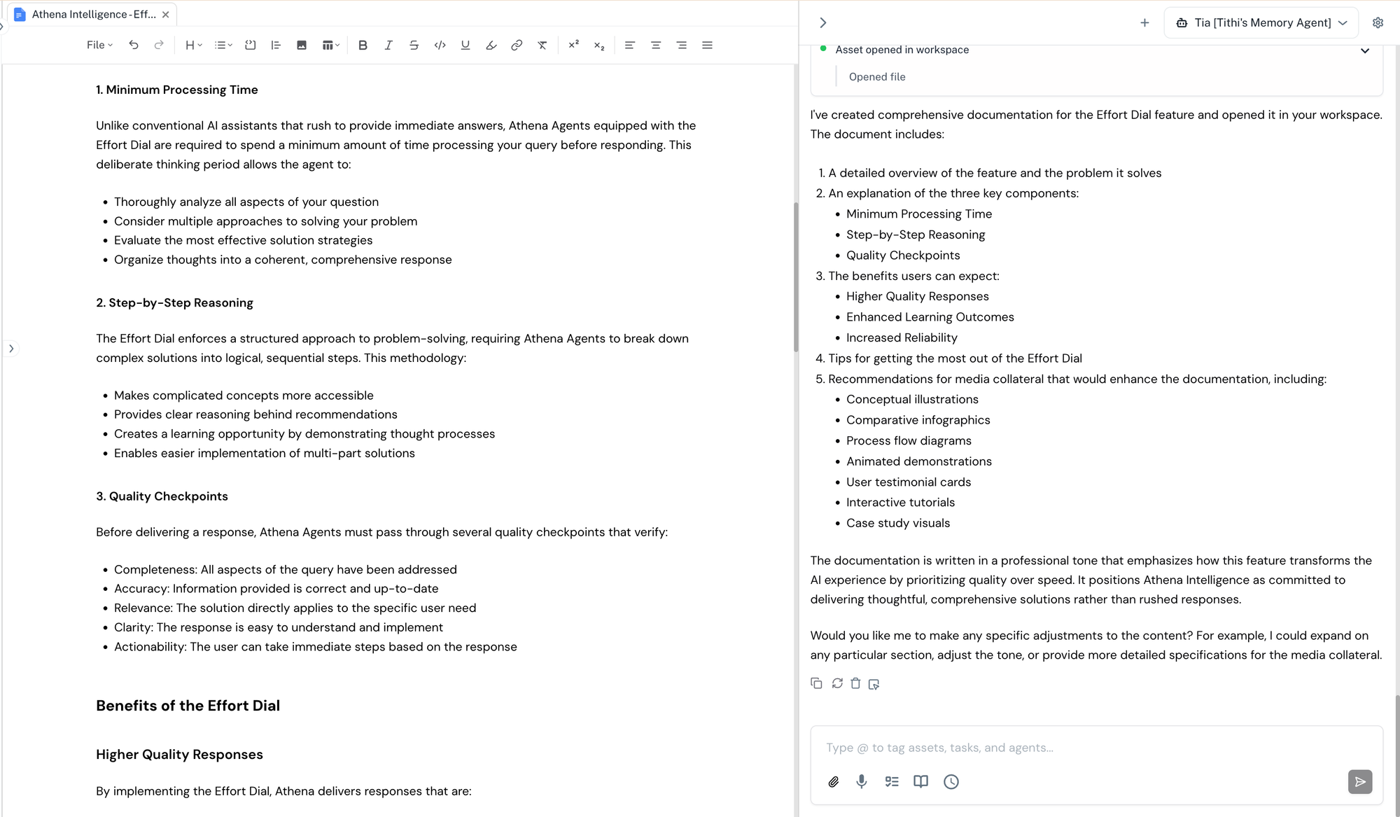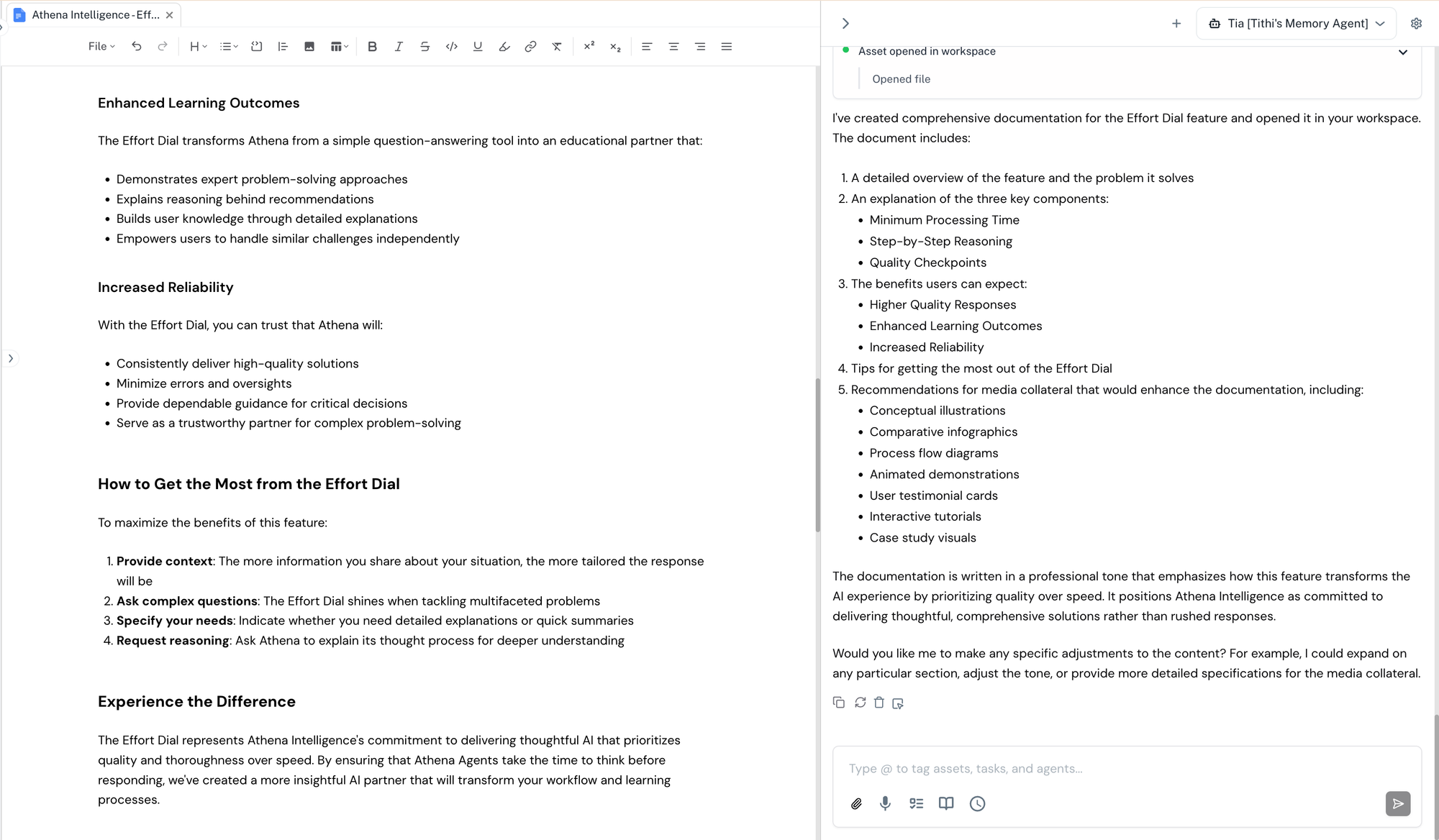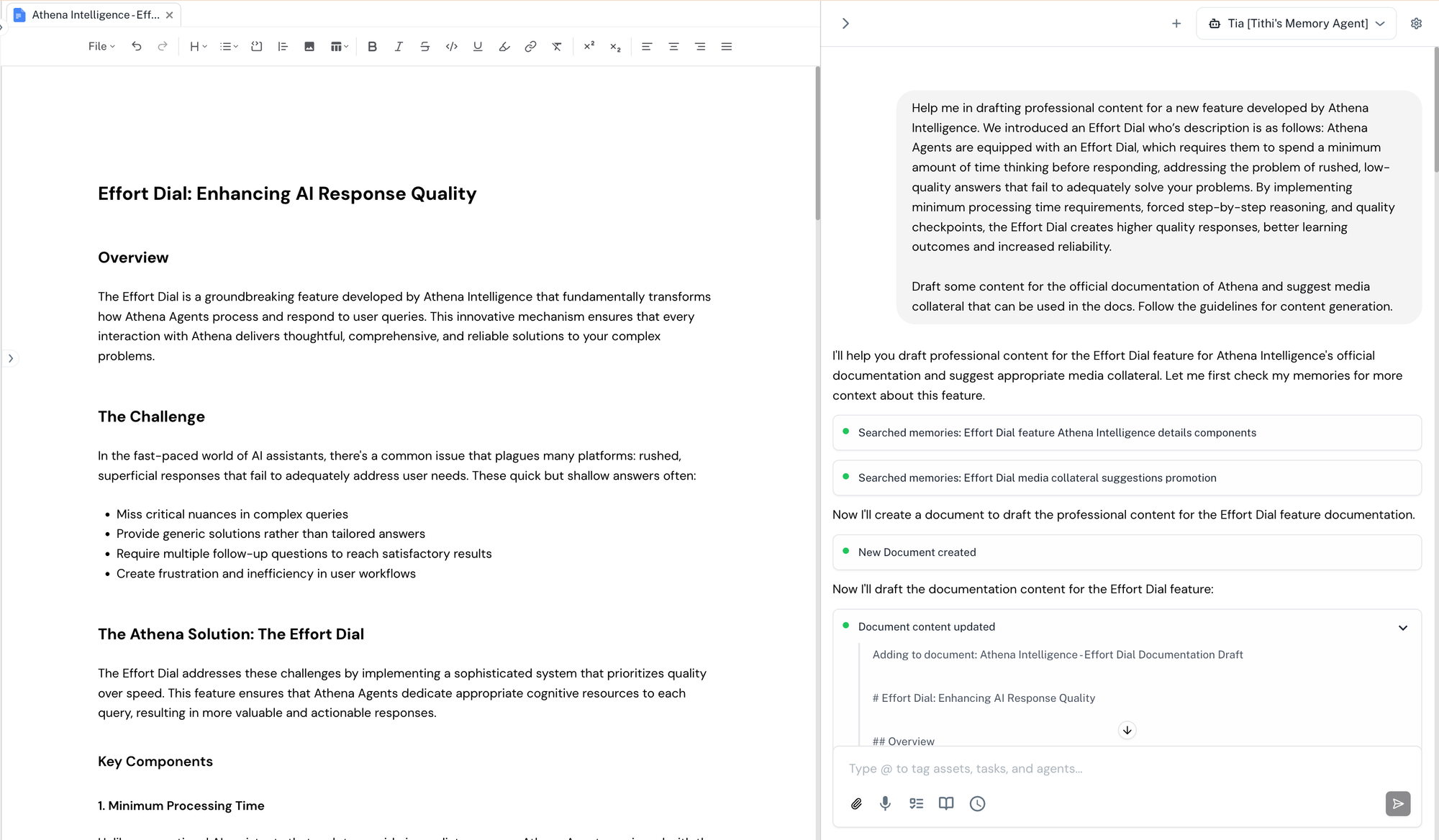 Tia was tasked with drafting official documentation content for Athena Intelligence. Her responses were evaluated to ensure accuracy, clarity, and alignment with the organization's standards and tone.