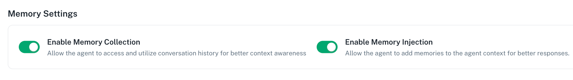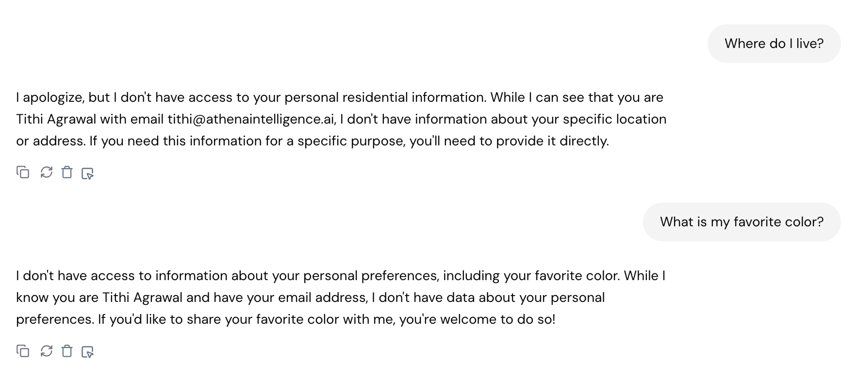 Note: Athena agents are designed with user privacy as a priority, offering the flexibility to easily toggle on or off the storing and fetching of memories. This feature ensures that users maintain full control over how their data is handled. When memory storage is turned off, no conversation data is retained, and when memory fetching is disabled, past information is not referenced in responses.