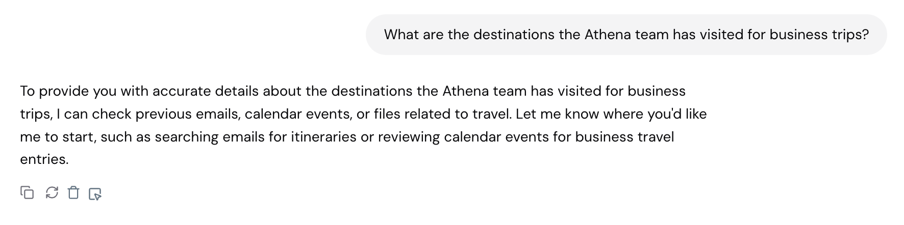 Information shared in previous sessions originally wasn’t retained by the agent, which meant that each conversation essentially started from scratch. In order to have a useful conversation with Athena, users had to repeatedly train Athena on the same knowledge points. This made Athena incapable of learning from her previous mistakes. The lack of memory also severely limited personalization capabilities. Athena’s answers couldn’t take past interactions into account which led to her providing generic answers instead of offering tailored responses.
