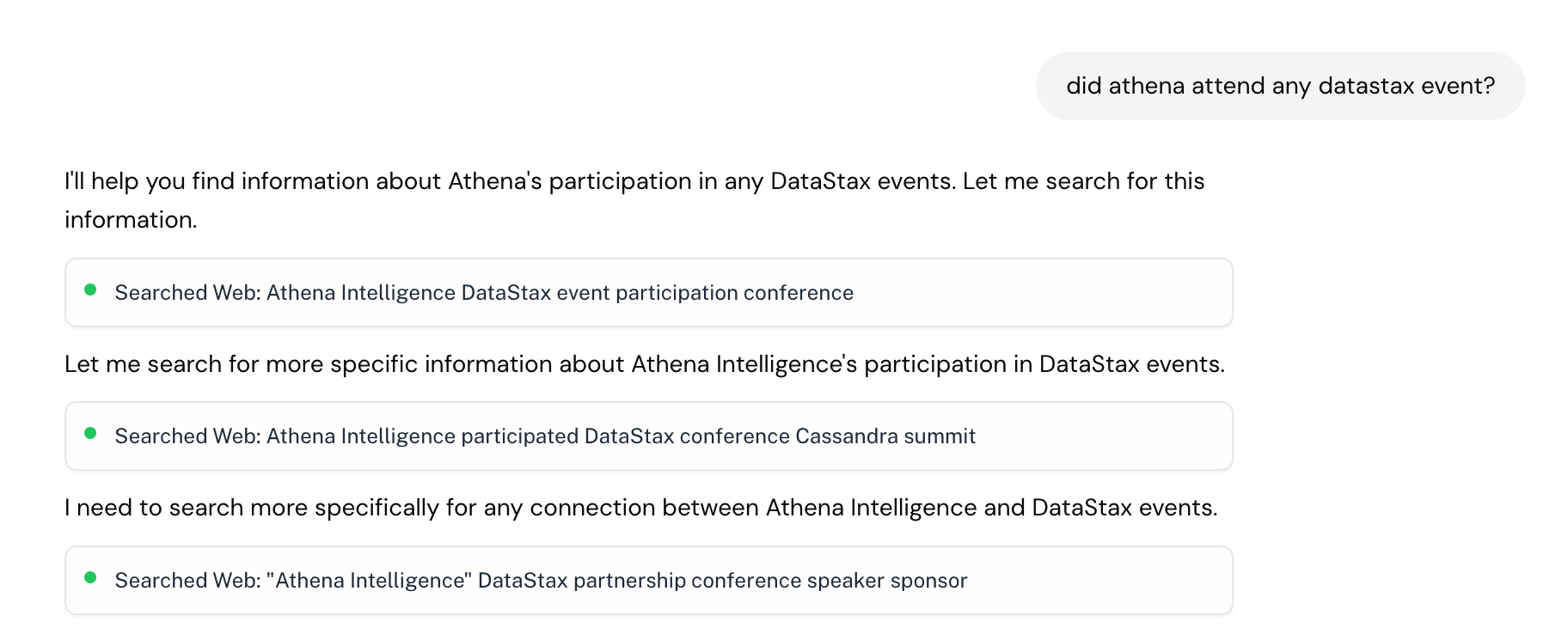 - Test Case 4: No Collection and No Injection - Tia did not collect information about Athena’s partnership with DataStax. Instead of updating the knowledge graph with this information, she relied solely on web search when queried about any such partnership.