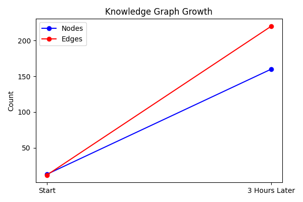 - Knowledge Graph Growth - The knowledge graph expanded from 13 nodes and 12 edges to approximately 160 nodes and 220 edges within a span of 3 hours, showcasing Tia's enhanced capacity to accept and organize vast amounts of information for retrieving accurate and contextually relevant responses.
