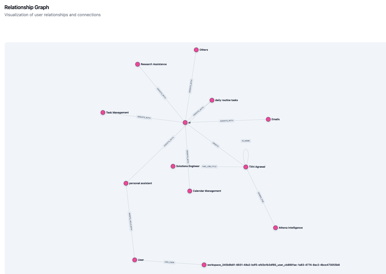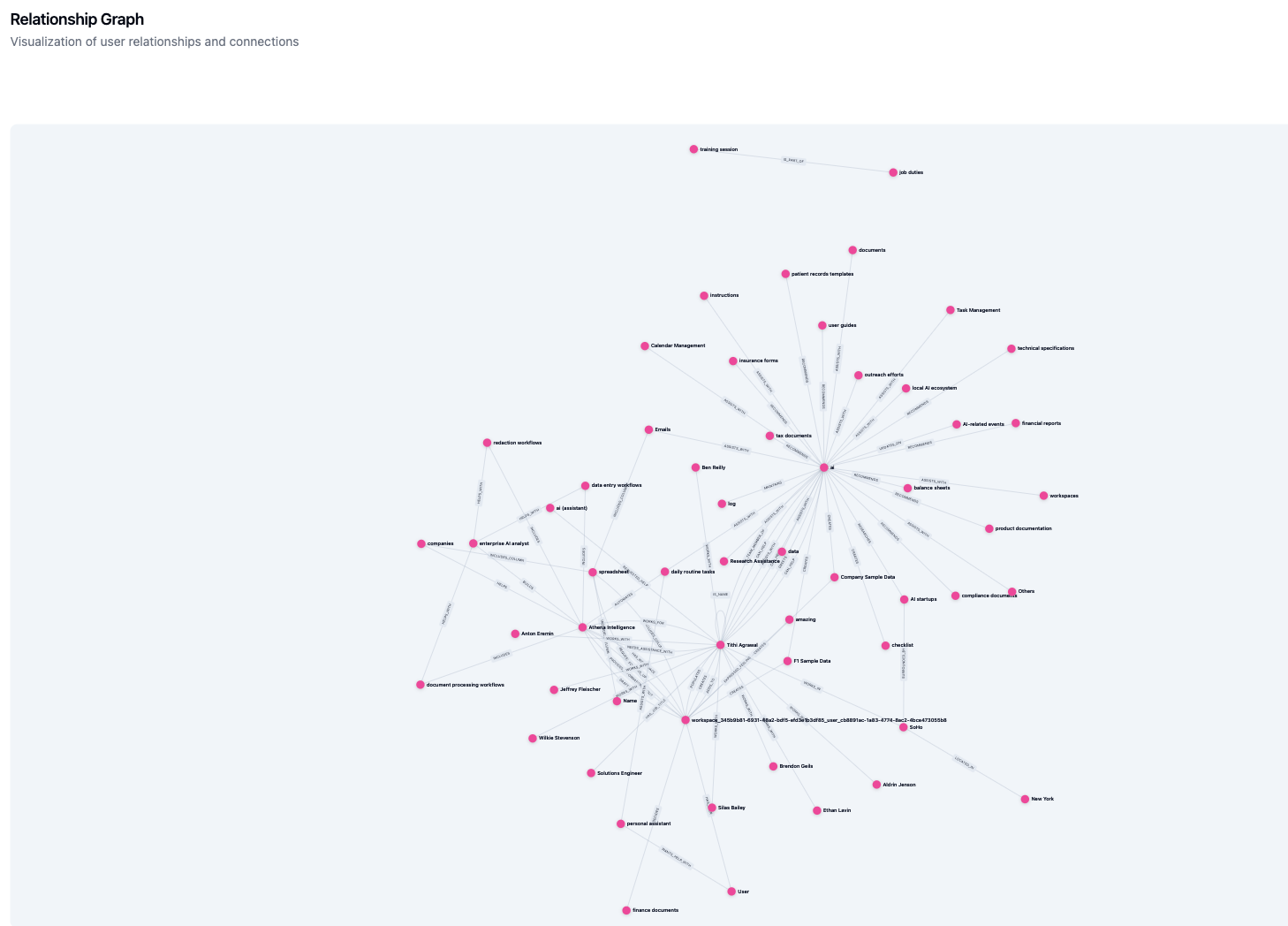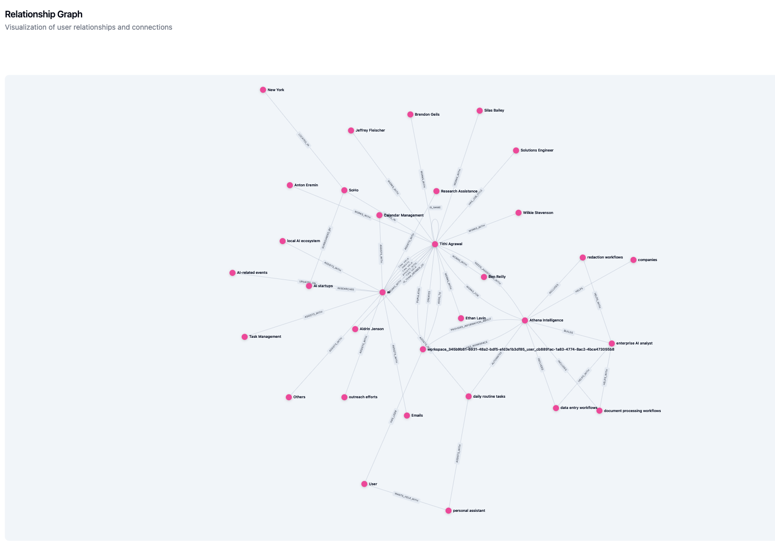 The training began with an introduction to my roles and responsibilities at Athena Intelligence. This was followed by educating Tia about Athena Intelligence, the team members, and their work. All conversations with Tia (known as sessions) were recorded in Zep, which generated a knowledge graph that serves as Tia’s brain. Below is a visual representation of the knowledge graph after the basic training.